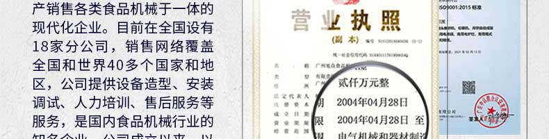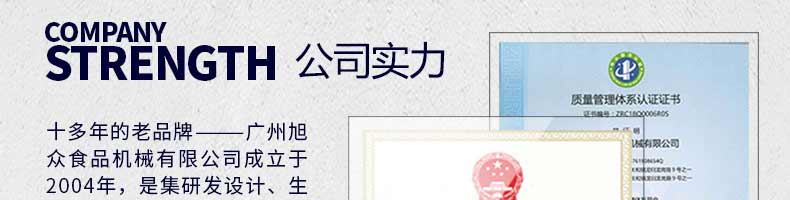 廣州旭眾食品機械有限公司是一家集科研開發(fā),生產(chǎn)設計,營銷服務為一體的現(xiàn)代化生產(chǎn)企業(yè)?,F(xiàn)代化生產(chǎn)車間,精湛制造技術,所產(chǎn)機械歷經(jīng)市場重重考驗,不斷贏得海內(nèi)外客戶的贊譽。