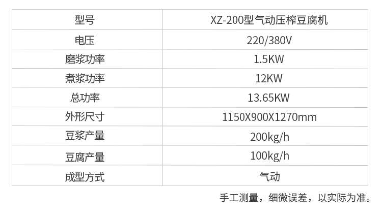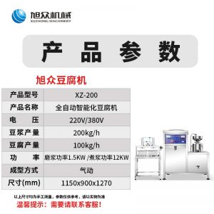 名稱XZ-300型氣動(dòng)壓榨豆腐機(jī) 電源220/380V 功率磨漿功率1.5KW,煮漿功率24KW,總功率25.65KW 產(chǎn)量豆?jié){產(chǎn)量300kg/h,豆腐產(chǎn)量150kg/h 尺寸1750X850X1300mm 重量聯(lián)系銷售員 規(guī)格聯(lián)系銷售員 其他成型方式:氣動(dòng)