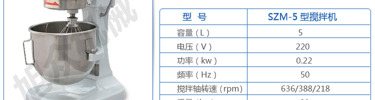 SZM-5型攪拌機,可用于攪拌奶油、蛋糕液、餡料及和制面團等操作。打蛋攪拌機等作攪拌食料、揉和面團之用,是生產(chǎn)優(yōu)質(zhì)糕點的理想設備,適用于酒店、飯店、學校部門、面包屋以及食品廠家。