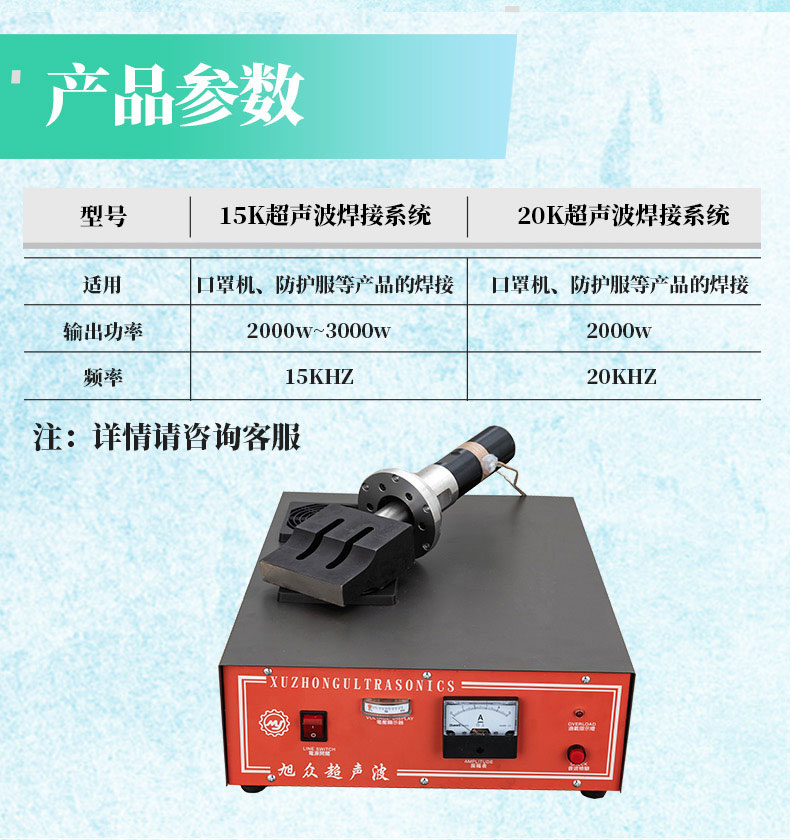 名稱口罩機15K/20K超聲波系統(tǒng) 電源 功率2000w-3000w 產(chǎn)量詳情咨詢13113134411 微信13113134411蔣經(jīng)理 尺寸詳情咨詢13113134411 微信13113134411蔣經(jīng)理 重量詳情咨詢13113134411 微信13113134411蔣經(jīng)理 規(guī)格 其他頻率 15KHZ-20KHZ